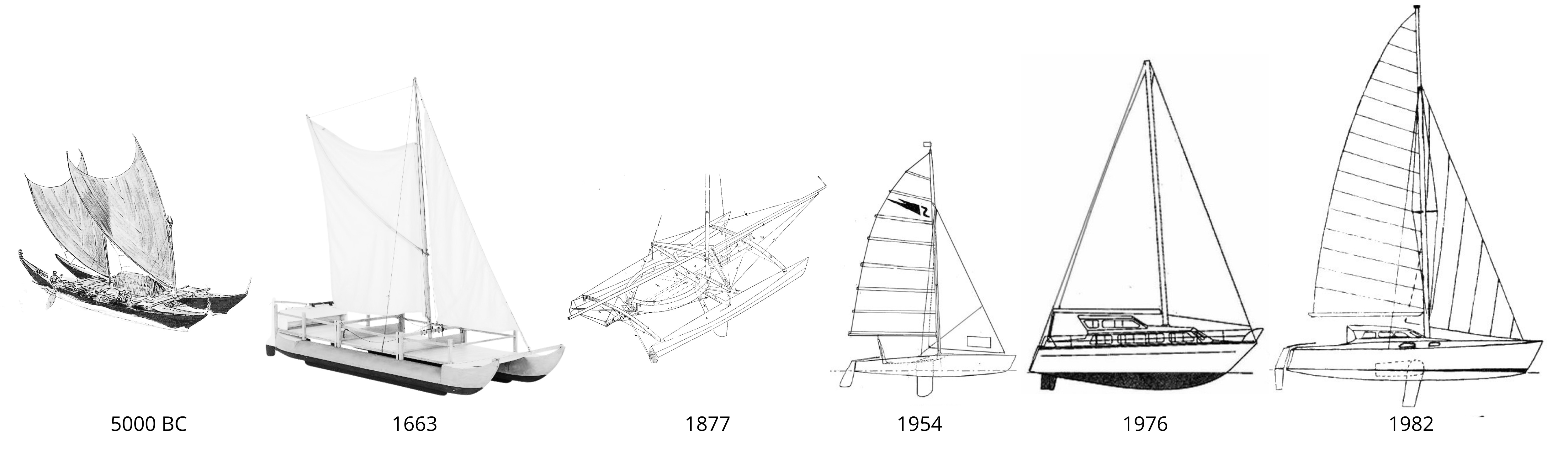 While double canoes, praos, and trimarans originated thousands of years ago in Oceania, the first Western catamaran on record was built in England by William Petty in 1663. It was a merchant ship named St Simon & Jude designed to sail in shallow waters faster, with less wind and a smaller crew than its competitors. Unfortunately, human skepticism and conservatism shelved the idea for several centuries before VELA revived it.